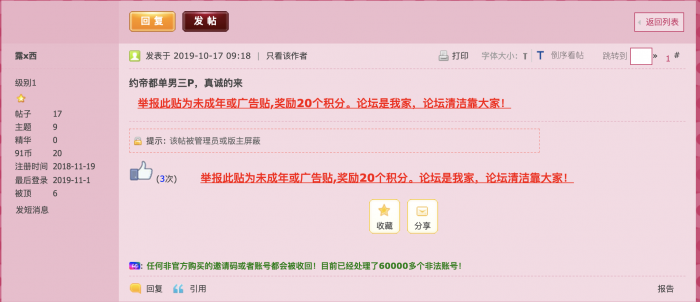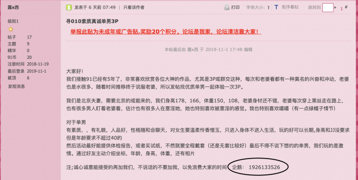 我暂时简单翻看了骗子在10月份的发帖纪录,一共有两个帖子,题目均为010寻单男。分别发布于10.17(内容已删): 。