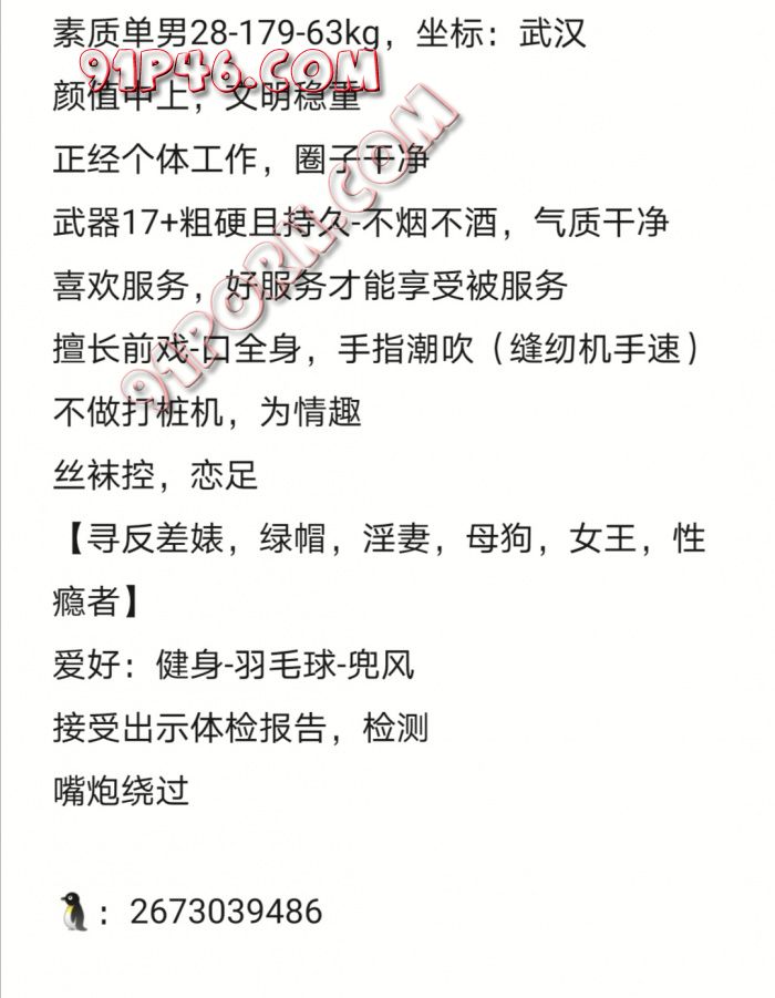 你们好,我是武汉高素质单男,29,173,125,企业高管,正装男,丝袜同好,会按摩,会调情,可以提供办公室环境或者其他环境,商务车等,也可以租妻,有想的可以联系我扣扣九5⃣️884⃣️5⃣️8⃣️8⃣️8⃣️期待有意向的夫妻情侣